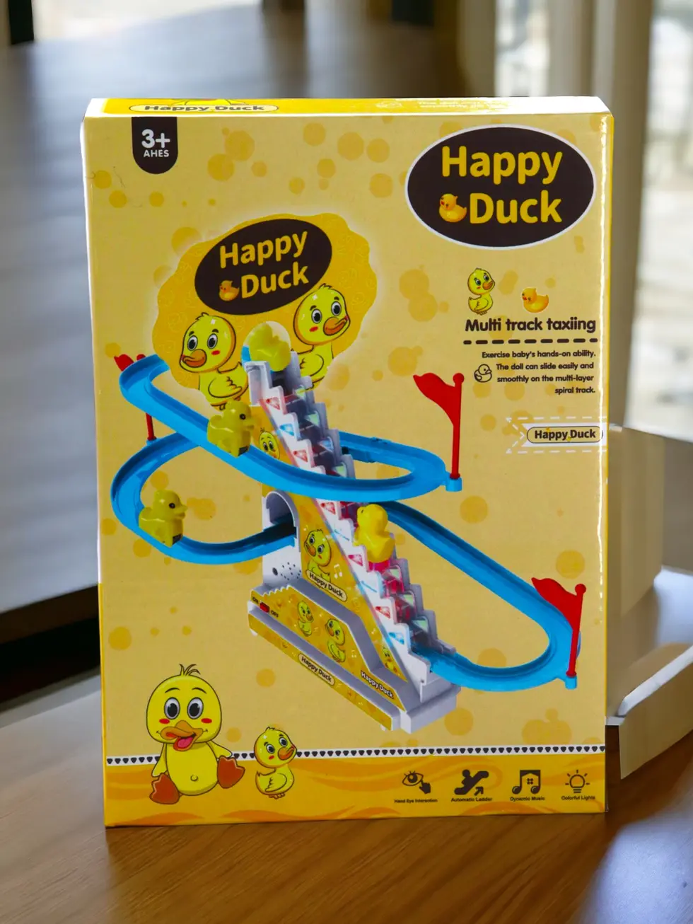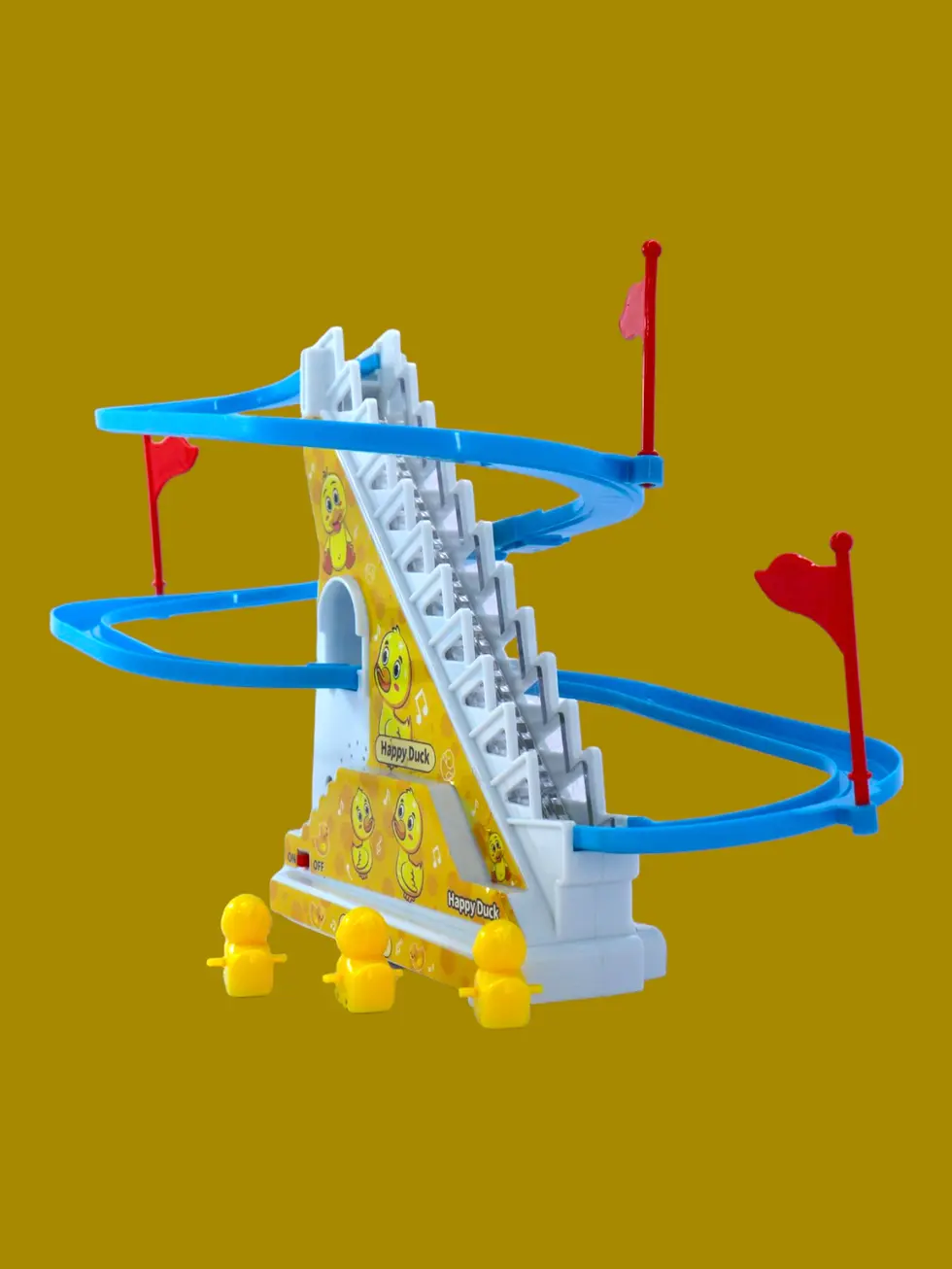 Unique Design: The toy set comes with a flashing LED light, which is easy to assemble. The toy contains cheerful music (with on/off button). Six happy little yellow ducks climb the stairs and slide down the slope happily.